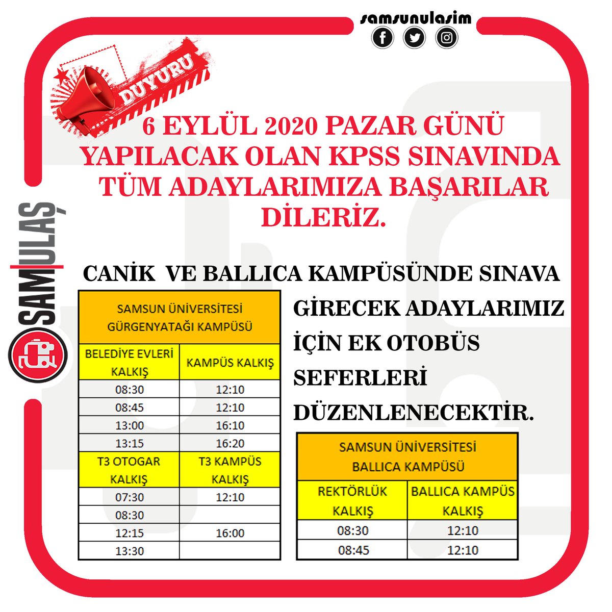 Samulas A S On Twitter Duyuru 6 Eylul 2020 Pazar Gunu Yapilacak Olan Kpss Sinavinda Ek Seferler Ile Hizmetinizdeyiz